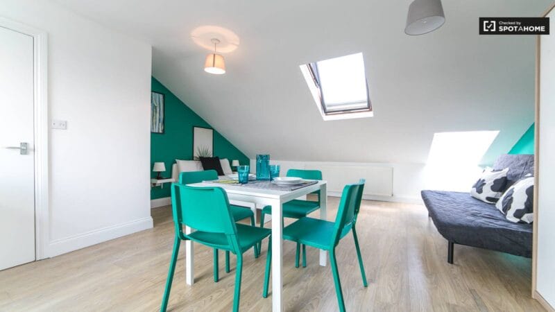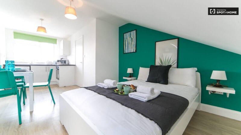 This bright studio apartment on Tubbs Rd in Willesden Junction offers a fully equipped kitchen and a combined living/bedroom area that has a double bed, sofa and TV. The bathroom in this charming flat has a shower and big mirror.